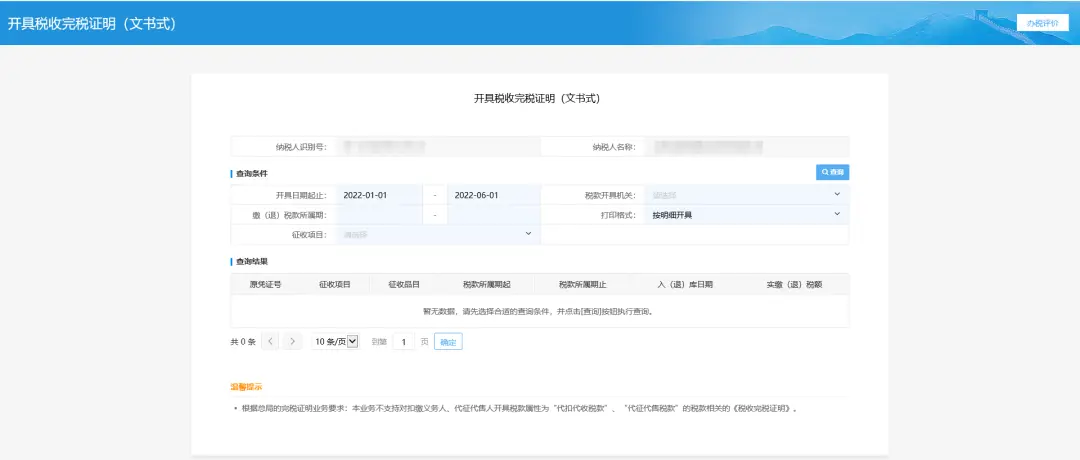 (2)表格式完税证明可通过电子税务局【我要办税】—【证明开具】—【开具税收完税证明(表格式)】查询开具,表格式完税证明仅能开具一次,如需再次打印,可通过电子税务局【我要办税】—【证明开具】—【开具税收完税证明(表格式)补打】模块操作。