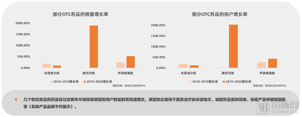 以往的医药行业的发展都是由医院或者线下零售市场做推动。在医药电商出现后,OTC 线上营销和独特的平台属性造就了部分专属趋势类目,典型的比如脱发、减肥、祛痘等。这些特定类目的高速增长,又反向作用于医药电商全渠道各个细分类目的发展,带动产业市场规模持续增长。