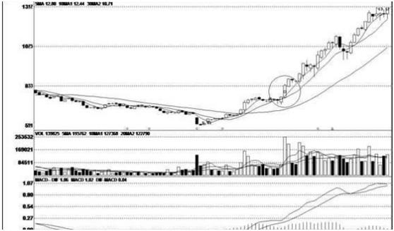 实例图,中环股份:股价企稳后出现小幅回升走势,然后展开洗盘调整,股价回落到前期低点附近再次企稳,疑似构筑双重底迹象。随后,5日、10日均线与30日均线呈收敛状态,2013年5月14日股价放量突破60日均线,随后股价短线有了不错的涨幅。这种方法经过长期实践后,总结归纳所得,其成功率非常高,中短线操作皆宜。之所以要两根均线收敛后,放量突破60日均线再介入,是因为经过庄家长时间的洗盘后市场成本趋于一致,再放量突破60日均线,则说明庄家洗盘结束,各方面条件都已具备,真正的快速拉升或牛市行情上涨将要开始。这里只是提供一个思路和方法而已,在实盘中有很多这样的例子,投资者不妨自我进行总结,一定会发现其中的奥妙所在。